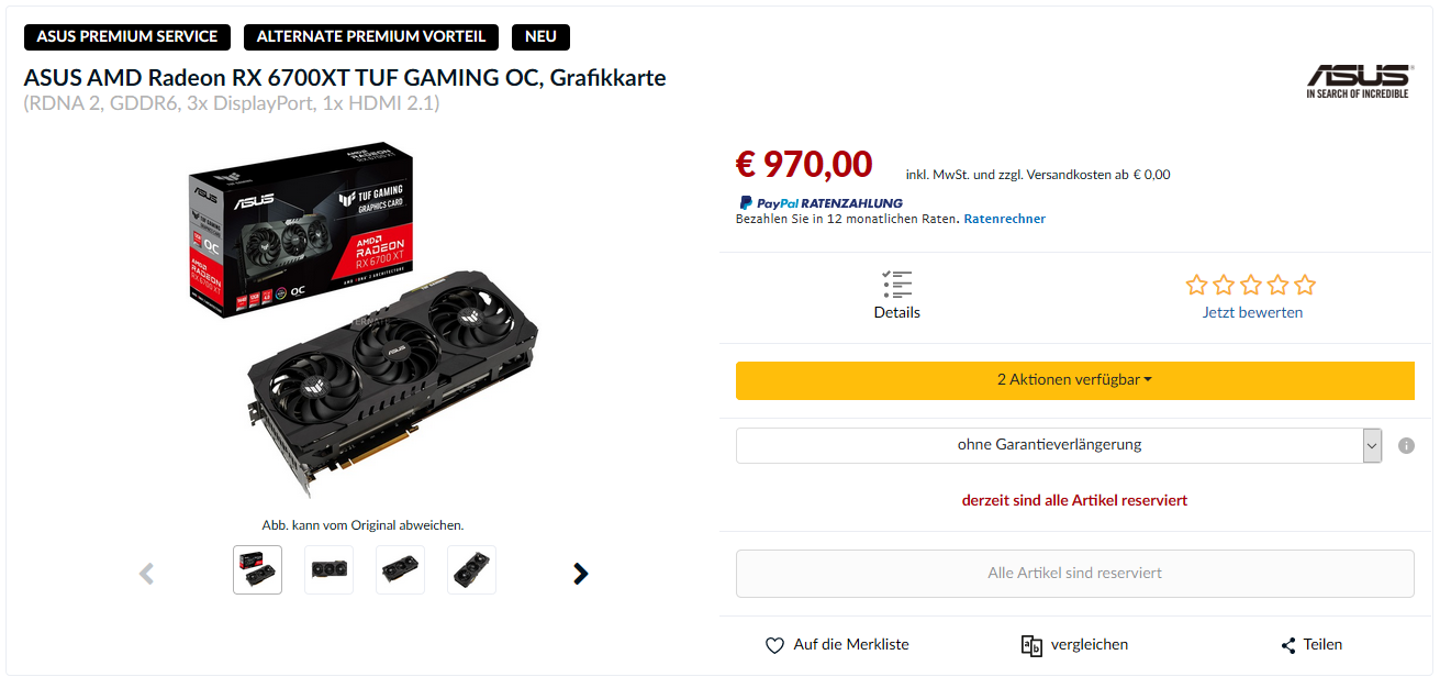 Alternate und Mindfactory sind wirklich die letzten Drecksläden. Die haben schon mit 700 Euro+ angefangen. Mir ist schon klar das wir in der Marktwirtschaft leben aber man kann es auch echt übertreiben. Bei denen gab es nicht mal den Versuch vom Start weg normale Preise zu bieten, nein, man muß sofort 50 Prozent draufschlagen. Pack.netbuster21 schrieb:Die Strix kostet bei Alternate mittlerweile 1049 €. Und die sind sogar alle reserviert zur Zeit. Bleibt nur die Gigabyte für 999€.