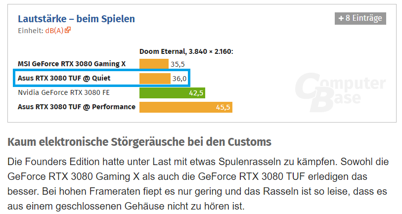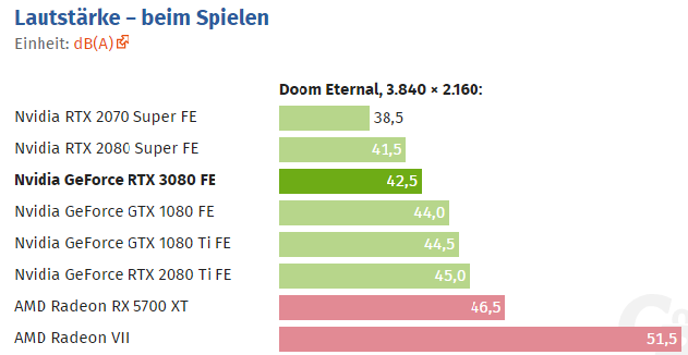 42.5 dB(A) bei der 3080 FE ist auch nicht wenig und die Partnerkarten sind teilweise über 5 dB leiser.