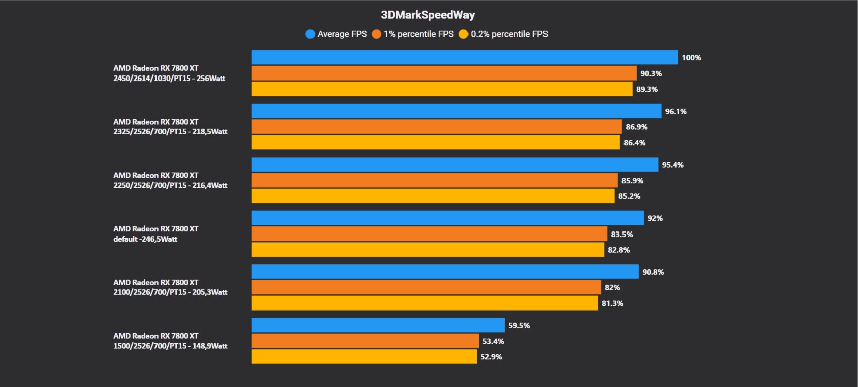 Meine Tests waren alle mit offenen Powertarget +15%. Könnten wir den Test bei 2450Mhz nochmal wiederholen? Vielleicht hatte ja jemand einen Bug in den settings.Flash_Muc schrieb:Außerhalb des Bereichs, den man gemütlich stabil bei sogenannten "700mV" im Treiber betrieben kann, also ab 2450mV überrrascht es mich dann wieder der Unterschied beim Verbrauch. Hier scheint sich die Pulse ja anscheind knapp 20 Watt mehr zu genehmigen - für 125Mhz mehr bei ein paar mV mehr erscheint mir das drastisch mehr Verbrauch. Aber auch die Red Devil braucht hier (weniger Undervolting und höherer takt) schon 6,7% mehr saft für 3,4% mehr Leistung.