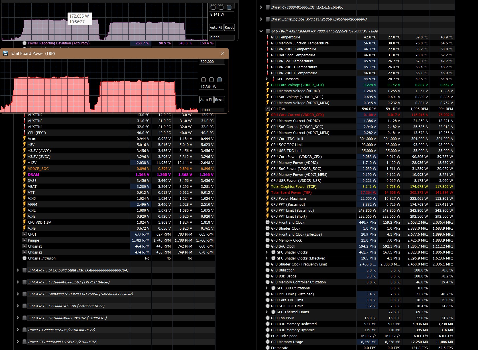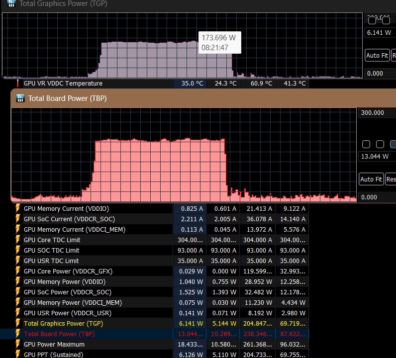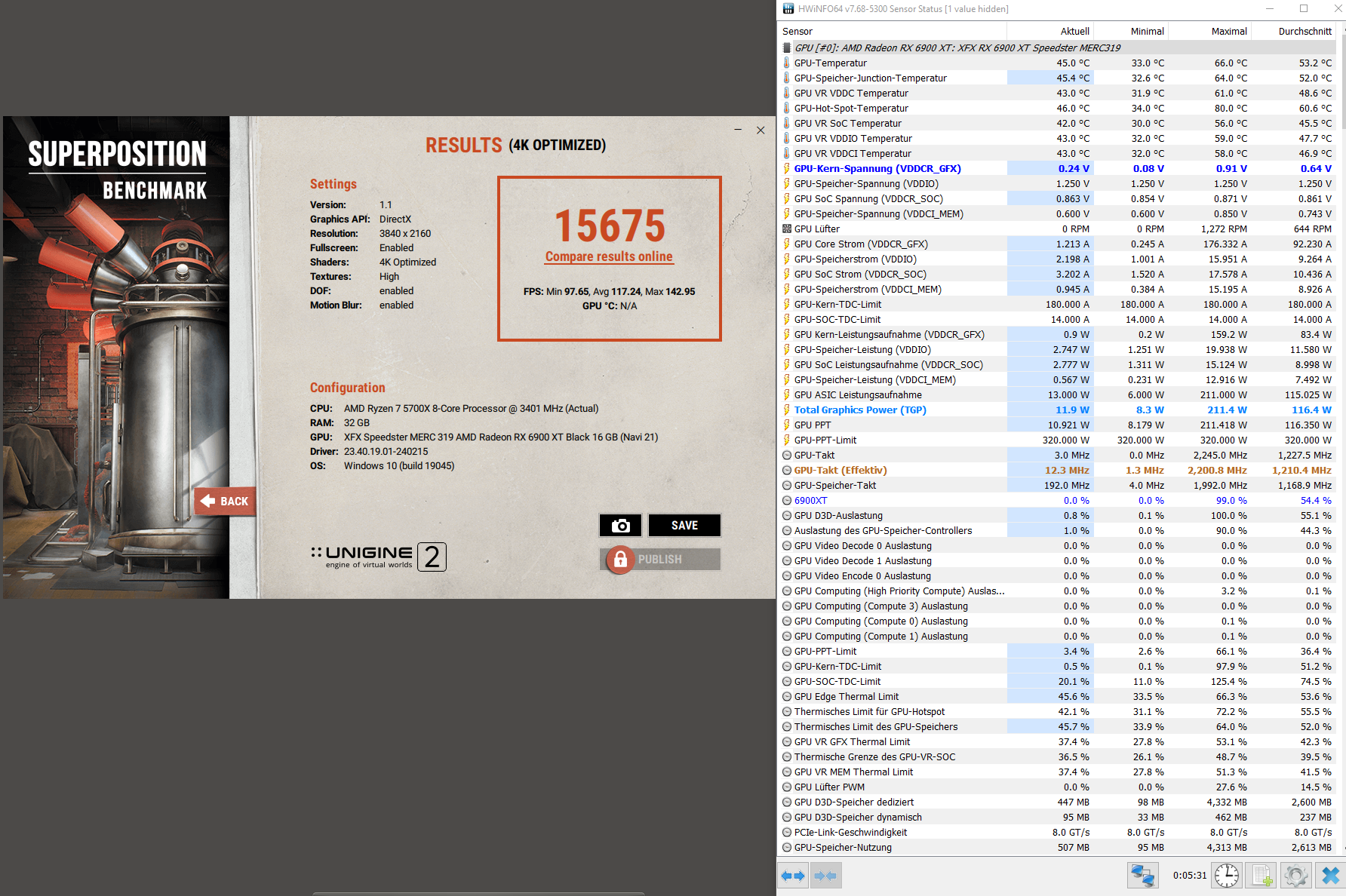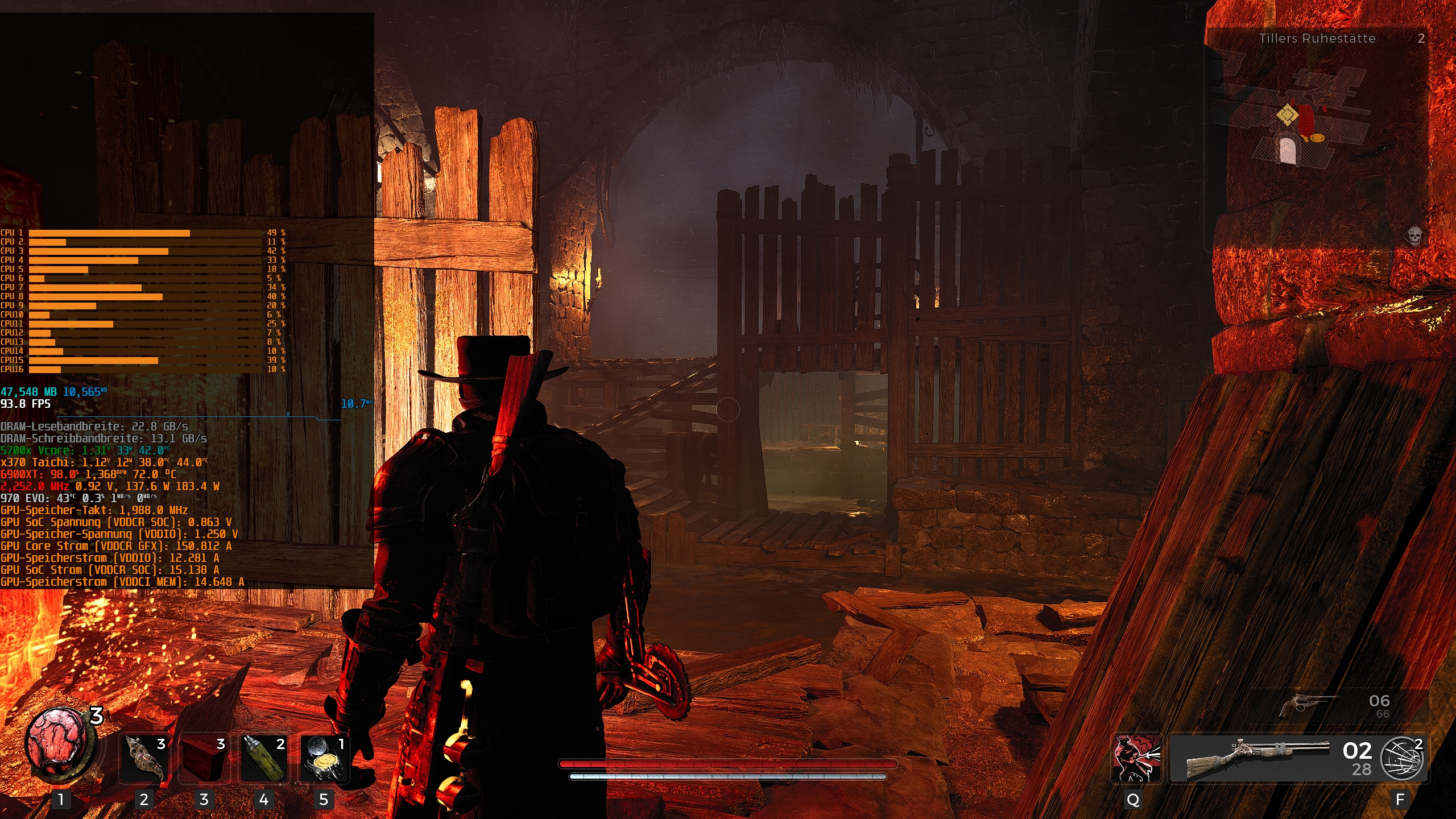211 W bei 0.91 V und 2.300 MHz. Wobei meist nur 2.250 anliegen und der Verbrauch in Spielen bei Vollauslastung nur bei etwa 180 Watt liegt. Remnant 2 (UE5) in 2K nativ, alles max., ausser Schatten auf hoch. 91 fps, die ich aber nicht brauche, da auf 60 fps cap und damit noch 50 % Leistungsfähigkeit Puffer.