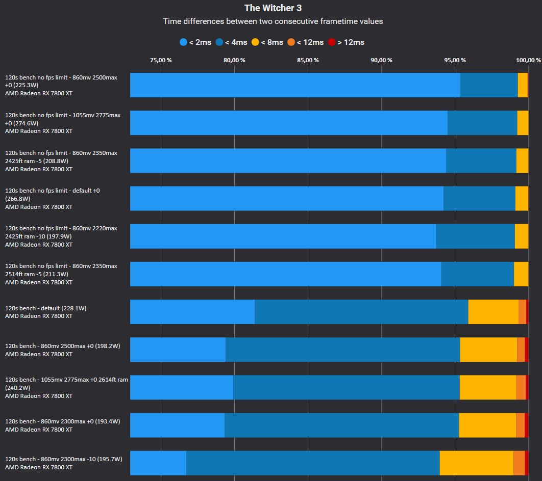 - Eine schöne Mischung sind etwa 2350 Mhz max, -5% Powerlimit, Ram Basistakt und fast timings, damit bekomme ich 1% fps von gut 57 und die Karte liegt bei knapp 60 Watt unter default