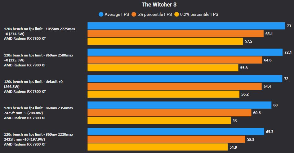 - Wirklich sparsam wird die Karte mit 860mV, 2220 MHz max, -10 Powerlimit und Basis Ram-Takt (wahlweise Fast Timings on) und sinkt nur moderat unter 60 fps, bei 70 Watt weniger Verbrauch