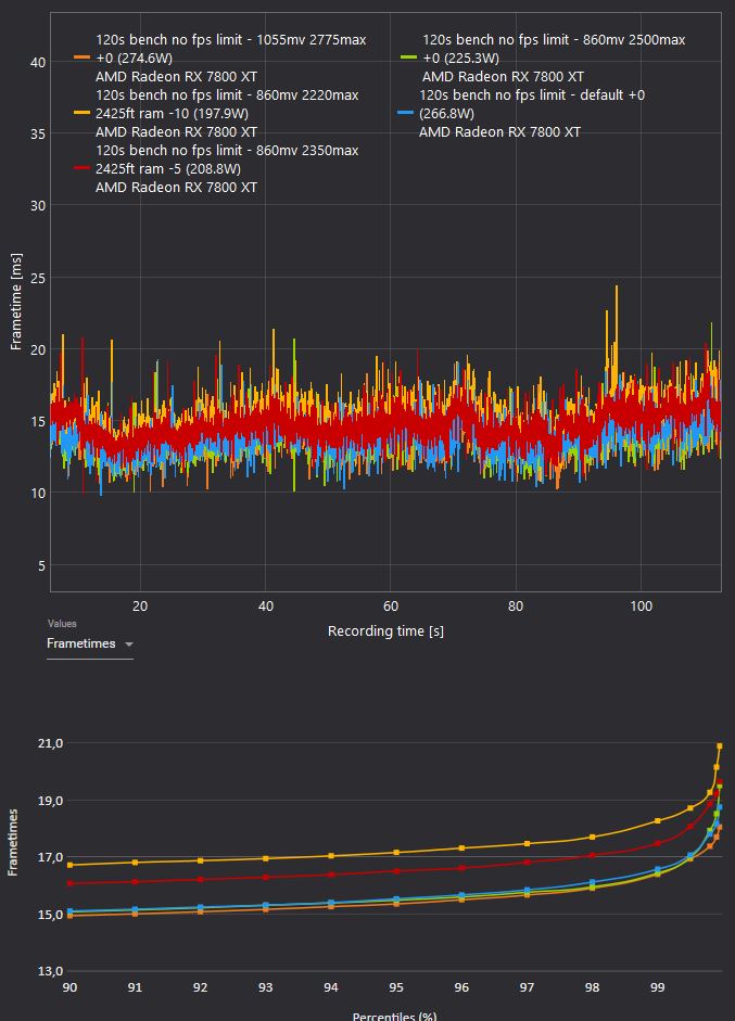 - Komplett flüssig bei deutlich reduziertem Verbrauch spielt sich die Benchmarkszene bei 860mV, 2500max, unverändertes Powerlimit (das war auch das beste setting mit Framelimit) - diese Setting ist auf dem gleichen Level wie die Treiberstandards, säuft aber über 40 Watt weniger