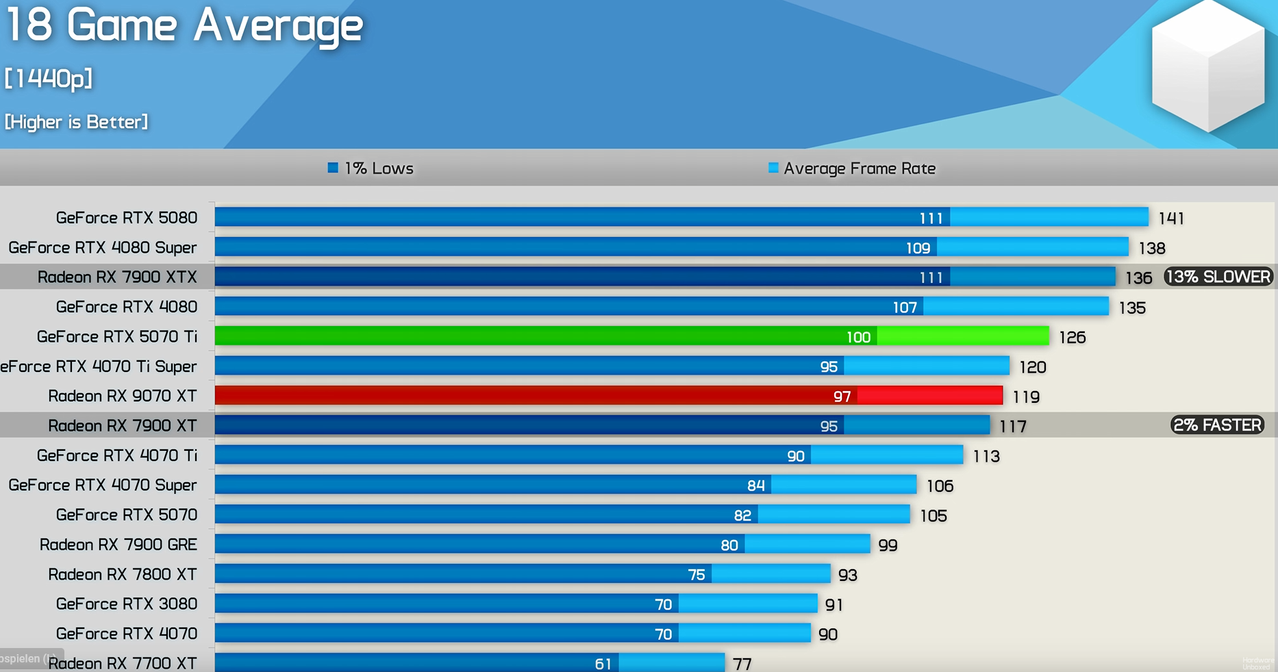 Je nach Test reicht fast nicht einmal für die 7900XT und die Blackwell Karten haben bei Hardware Unboxed underperformt, weil sie in einem Spiel unerklärlich langsam waren. (BUG)Pisaro schrieb:Wie kommst du denn auf den Schwachsinn? Die 9070XT kommt gerade so an eine 5070Ti ran.