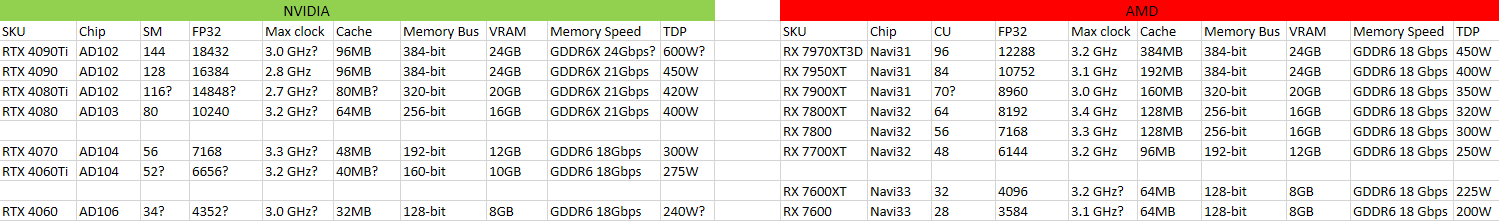 Dann werde ich auch nochmal meinen Senf dazugeben. Die Tabelle von RGT ist eigentlich gar nicht so schlecht, was ein Lineup auf Basis der bereits vorliegenden spekulierten GPU-Konfigurationen von Navi 31,32 und 33 angeht.