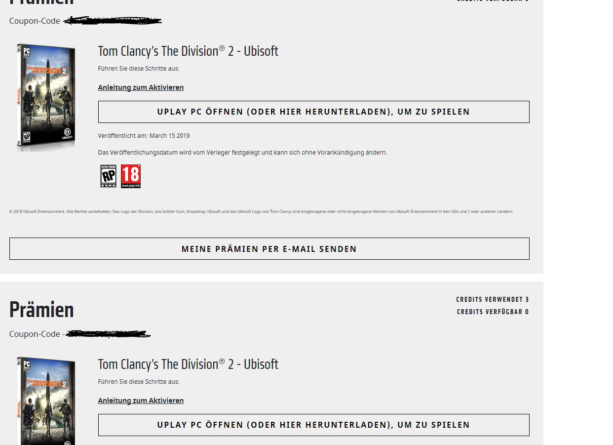 Ich musste meinen UPlay Account auf der AMD Seite verbinden um TD2 freizuschaltenentengruetze schrieb:Also bekommt man bei The Divison 2 keinen separaten Key? Wollte nämlich den zweiten nen Kumpel geben.....