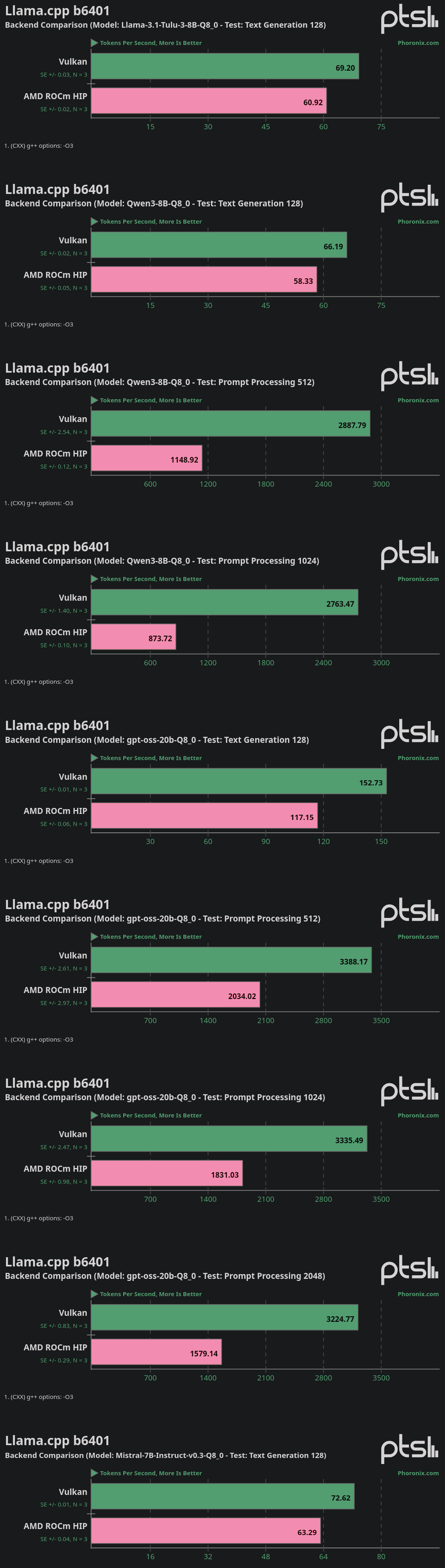 So from the same system while running Ubuntu 24.04.3 LTS + Linux 6.17, I ran some Vulkan vs. ROCm 6.4.3 benchmarks with Llama.cpp on the Radeon RX 9070 XT. (NOTE: This testing wrapped up last week, prior to yesterday's ROCm 7.0 release. ROCm 7.0 benchmarks will come later.)