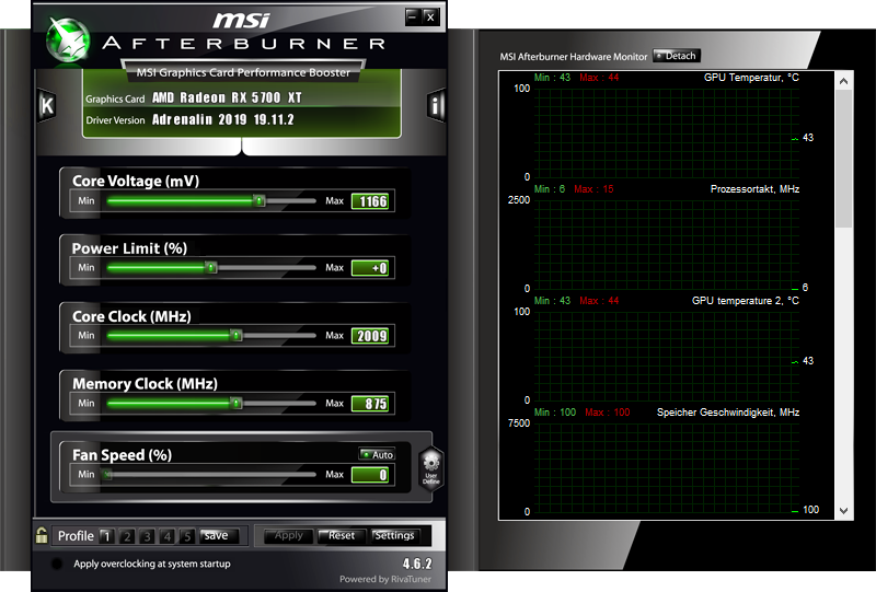 Nach langem Probieren habe ich nun für meine RX 5700 XT eine vernünftige Einstellung gefunden, die einen guten Kompromiss aus Lautstärke, Leistung und Stromverbrauch bringt: