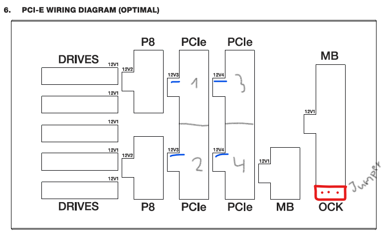 So wie ich das verstehe, dieses Jumper verbindet 12V3 und 12V4 zusammen, sodass ich in jede PCIe Slot das Y-Kabel reinstecken kann. (im Lieferumfang gibt es NUR Y Kabels, 8 Stück.)