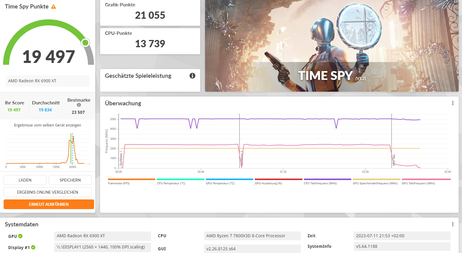In den 3D-Mark Läufen erkennt man gut, wie konstant der Takt verläuft. Das Leistungsergebnis, obwohl nicht auf die Höchstepunktzahl abgezielt, kann sich auch sehen lassen.