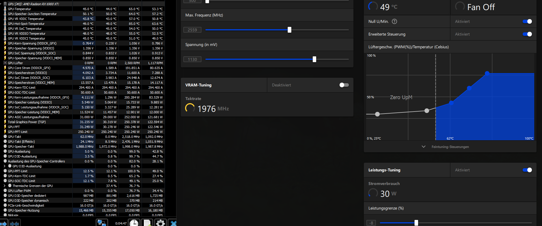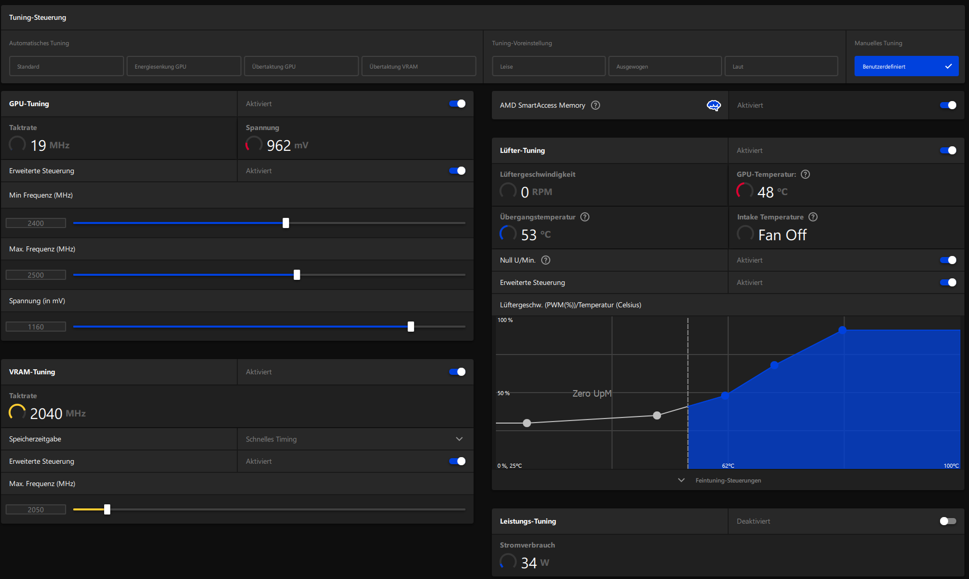 Wie damals beschrieben arbeite ich mit dem MPT, dem RadeonSoftwareSlimmer und der Leistungskonfiguration des AMD Adrenalin Treibers.