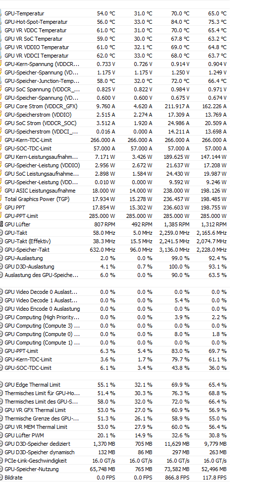 Im Durchschnitt immer so zwischen 205 und 210w. Die 230w ist irgendwann wohl ein Peak gewesen. Auch der Hotspot von 85 Grad ist ein Peak....Die meiste Zeit immer unter 80Grad. Und im Durchschnitt 910mv ist doch sexy😊