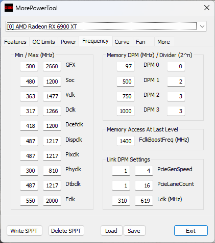 Während die 6700XT relativ üppig dimensionierten Speicher und Cache hat und mehr vom Speicher-OC als dem OC des Infinity-Caches profitiert, verhält sich die 6900XT ähnlich wie die 6600XT, die von größerem und schnellerem Cache deutlicher profitiert. Insofern habe ich die 6900XT´s die ich bisher einstellen konnte auf einen FCLK-Takt von 2000MHz gebracht und den Speicher auf die jeweils erlaubten 2150MHz gestellt. Die dadurch gesteigerte Bandbreite versorgt den großen Chip besser mit Daten, weshalb bei gleichem Kerntakt in vielen Fällen die Rechenleistung steigt und vorallem die Minimum-FPS besser werden und damit auch der Frameverlauf homogener.