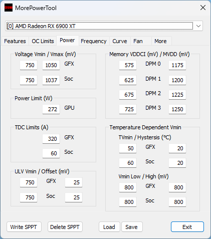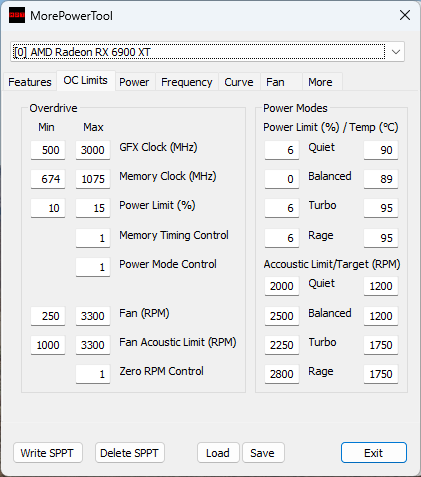 Im MPT lege ich die Minimal- und Maximalspannung der jeweiligen Komponente auf der Grafikkarte fest. Mit dem Treiber stelle ich dann die Taktraten und das Spannungs-Offset, sowie die Lüfterkurve ein. Der RadeonSoftwareSlimmer hilft mir das Ryzen Master SDK und Automatisierungen des Treibers garantiert zu unterbinden.
