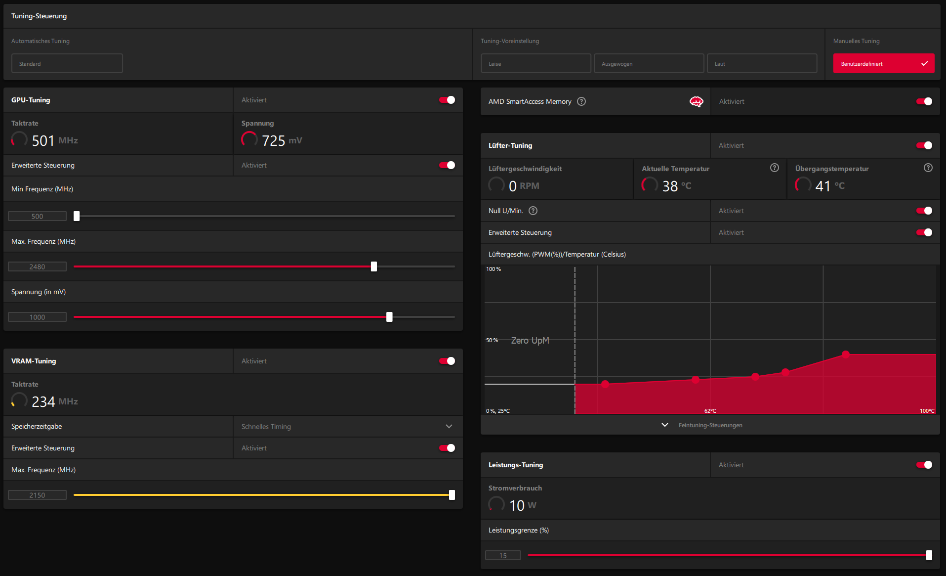 Wie damals beschrieben arbeite ich mit dem MPT, dem RadeonSoftwareSlimmer und der Leistungskonfiguration des AMD Adrenalin Treibers.