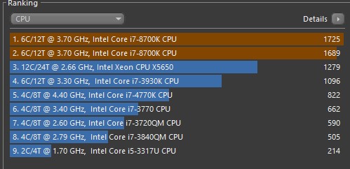 Ein 2700X mit 3200er CL14 RAM-Kit und OC auf 4,2Ghz All-Core macht 1866 Punkte. Da kommt auch kein 1800X selbst mit Optimierung hin. Sind 7,5% weniger für den 8700K trotz weniger Threads mit Sicherheit kein schlechtes Ergebnis.
