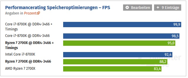 Die größer Dimensionierten Caches der Zen+ Architektur und die gesunkenen Latenzen können zum Teil den Nachteil in der I/O Leistung gegenüber der Coffee Lake Architektur ausgleichen (welcher die Speicherlatenz mit DDR4-4600 auf 35ns drücken kann).