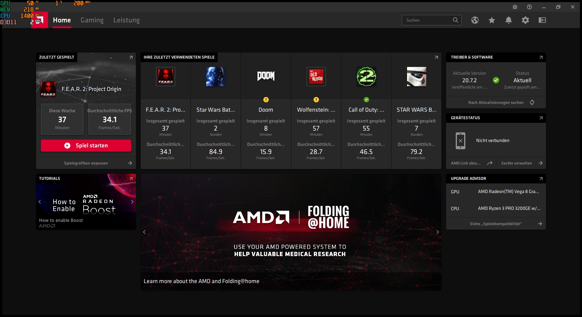ich hoffe ihr könnt mir helfen. Vor kurzem habe ich meinen AMD Phenom mit Geforce GTX 660 gegen einen Lenovo Thincentre tiny AMD Ryzen 3 3200 g mit vega 8 Grafik eingetauscht, da ich kaum noch zocke. Überwiegend spiele ich ältere Spiele wie Fear, COD 1-4, Far Cry, Crysis usw. die im Schnitt ganz gut bei hoher Grafikeinstellungen zwischen 40 und 90 FPS laufen bei Full HD Auflösung 1980-1080p.