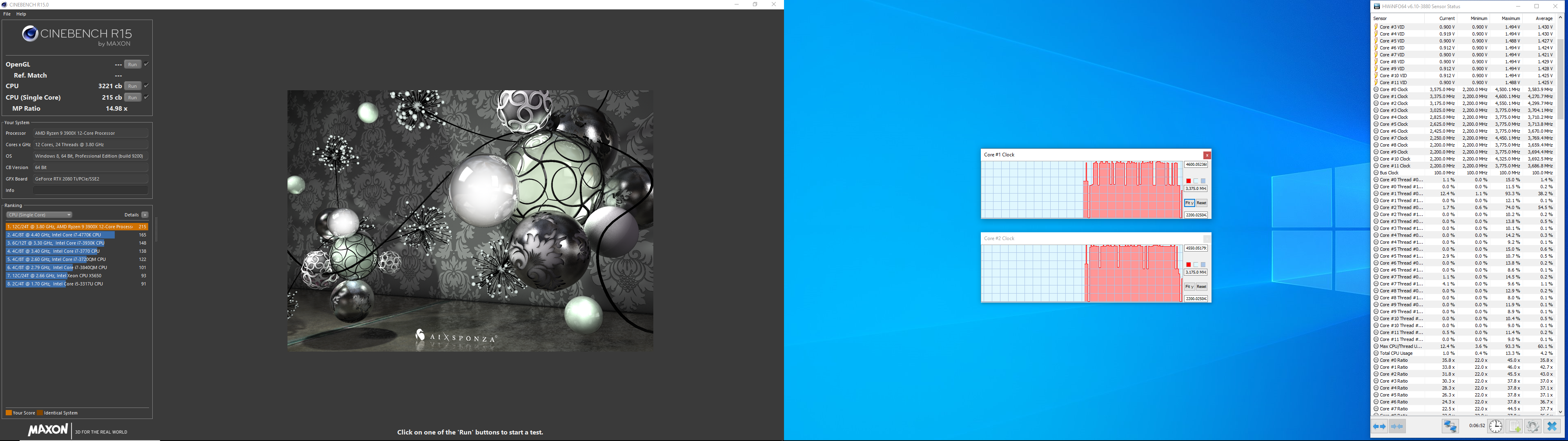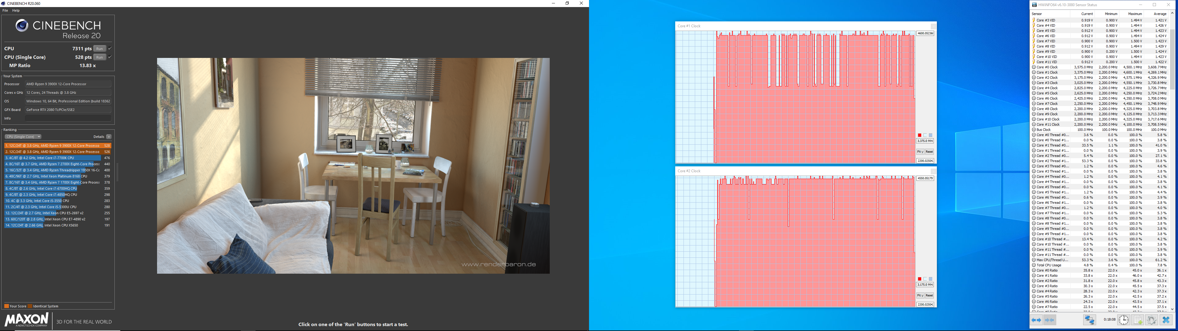 Bios Einstellungen wurden vom Vorgänger-Bios übernommen. Also PBO auf Auto und einzig allein der RAM wurde bei beiden Versionen auf 3733CL14 übertaktet. HWiNFO64 diente mir zum Überprüfen des Taktes (Refresh 2000ms) und wurde bei jeden Cinebenchlauf kurz nach dem Start resetet (zumindest so der Plan, wurde nicht immer konsequent eingehalten