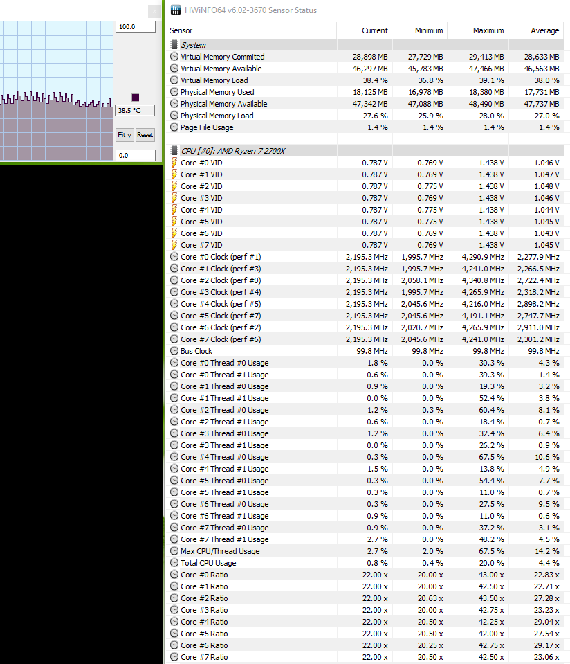 Ich hab dazu mal einen Screenshot von meinem 2700X angehängt. Das ist kein völliges Idle, es ist ein Haufen Programm beim Nichtstun offen, aber z.B. der Web-Browser tut bei den vielen Tabs ja immer irgendwo was. Aber man kann sehen: