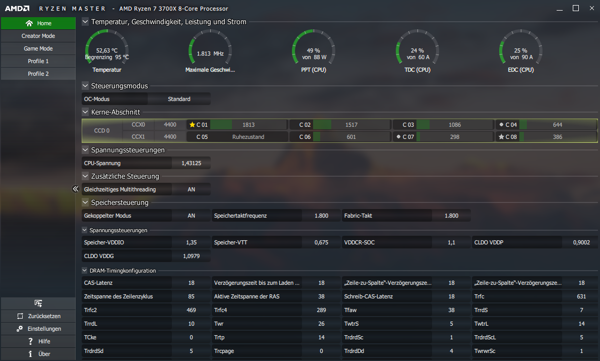 Schau dir mal die Werte in den Kästchen der Kerne beim Ryzen Master an. Das sind laut AMD die genauen Taktraten der Kerne, die dir kein anderes Tool so ausgeben kann.Cl4whammer! schrieb:@HerrRossi Aber er bleibt dann bei die auch die ganze Zeit bei seinen 84% oder? Runter auf 1% geht er nicht oder?