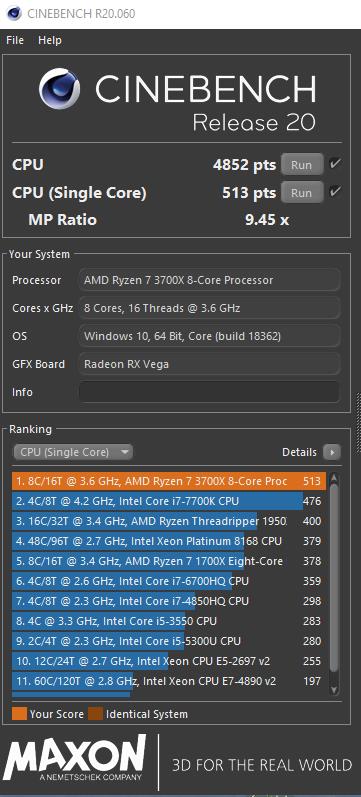 vom 3900X runtergerechnet müsste ein 3700X bei 501 liegen und genau da liegt meiner auch, bei CB sind es 502.