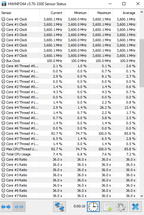 Alle anderen Kerne werden überhaupt nicht benutzt, bzw. springen nur bei sonstigen Hintergrundlasten mal kurz an (wie man an der durchschnittlichen Usage sieht) und bleiben brav bei ihren 3,6GHz.