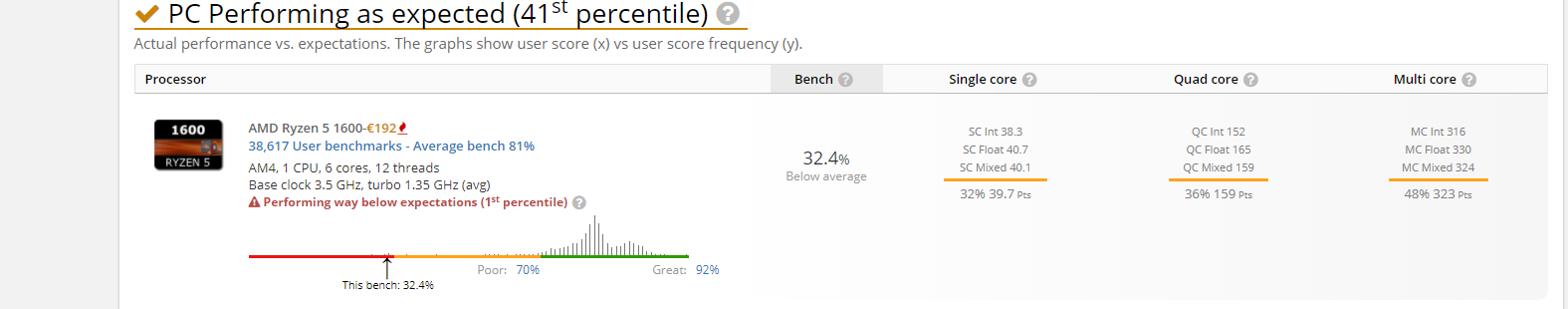 ich habe mir vor einem Monat meinen ersten eigenen PC gebaut. Er besteht auf einem AMD R5 1600 und einer RX 580. Als ich Assassins Creed Origins spielen wollte, hatte ich nicht mehr als 30 FPS und die CPU und GPU wahren nicht stark ausgelastet. Es hat auch keinen Unterschied gemacht, wenn ich die Grafikeinstellungen runter gedreht habe, es waren immer um die 30 FPS. Vor ein paar Minuten habe ich dann einen Hardware-Benchmark gemacht und dabei kam ein komisches Ergebnis raus (Bild ist als Anhang dabei). Die Temperatur des CPUs ist auch im grünen Bereich (Bild auch dabei).