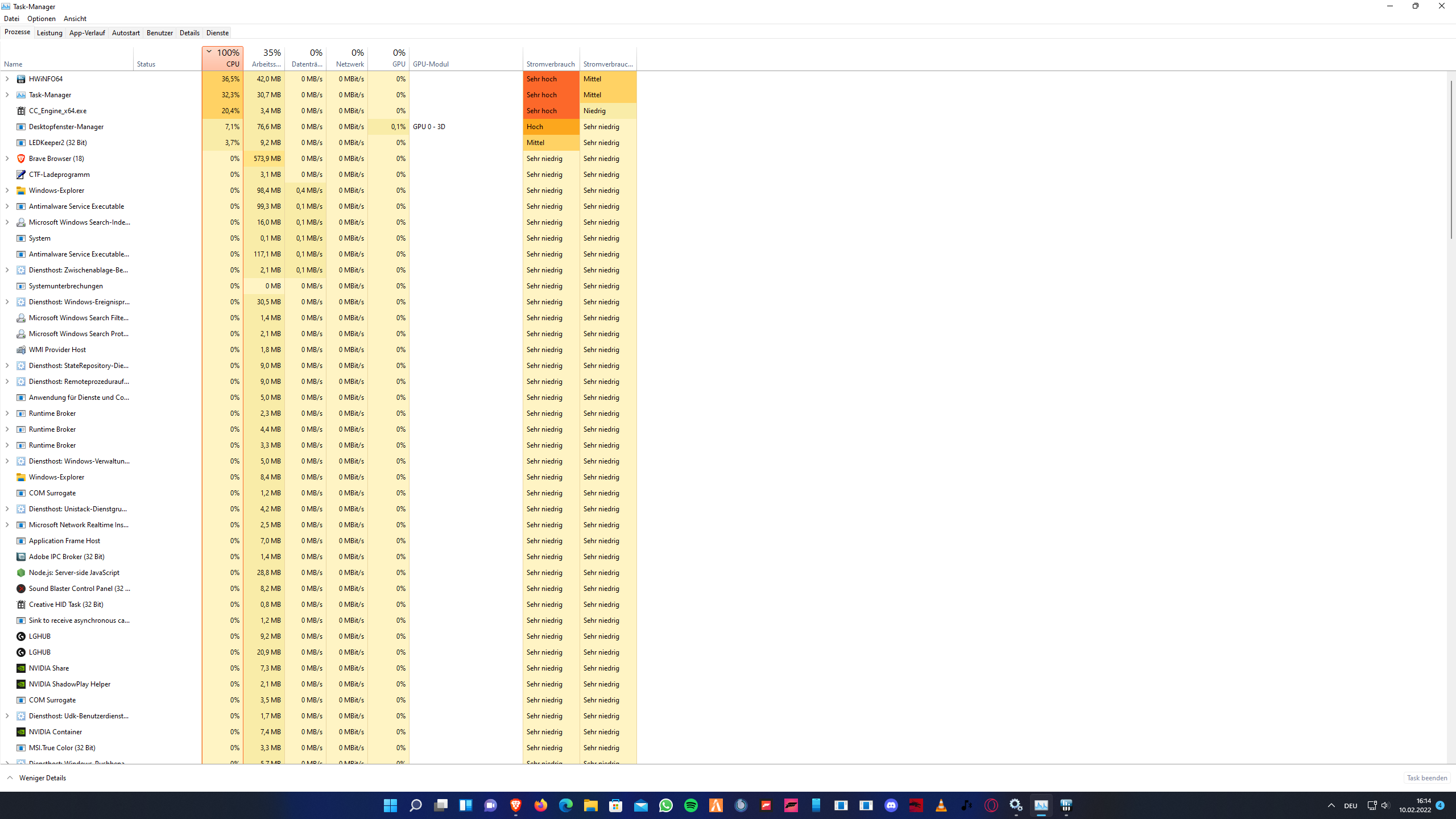 Okay CC_Engine_64 scheint was vom MSI Center zu sein? Das Center ist der letzte Dreck. Hatte damit auch nur Probleme und hohe Auslastung für NIX. Deaktiviere mal den Task und den HWINFO Task damit sollte es dann normal sein.