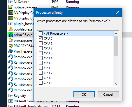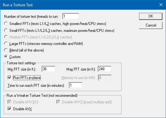 Achtung: der CuveOptimizer testet standardmäßig im "SSE"-Modus, im Fenster von Prime95 entspricht das deaktivierten AVX2- und AVX-Checkboxen. Zusätzlich müsste dann noch die Anzahl der Threads auf 1 gesetzt und die Affinity von Prime95 im Taskmanager auf den jeweiligen Kern gesetzt werden (hier ist dann zu beachten, dass die Zählung bei 0 beginnt, "CPU 0" ist also der erste Thread des ersten Kerns, "CPU 1" der zweite Thread des ersten Kerns, etc)
