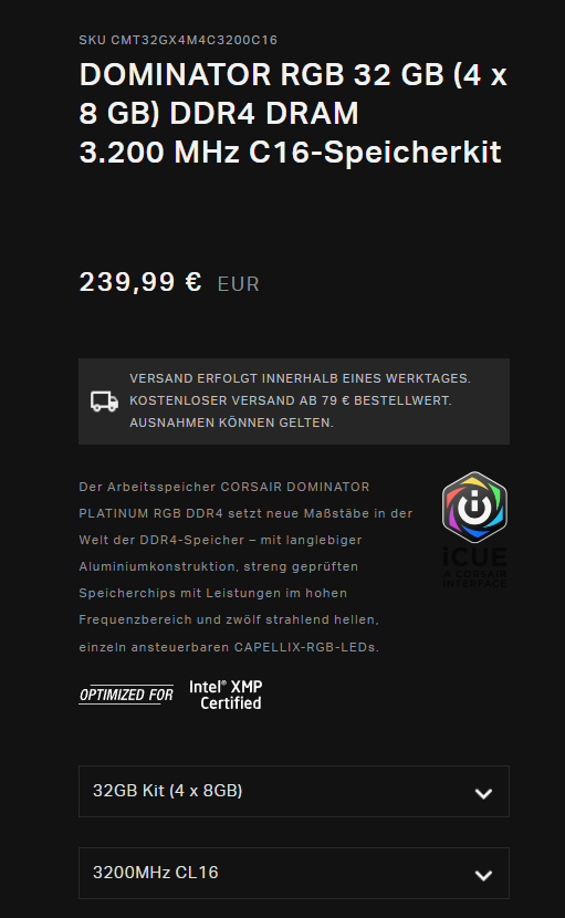 Corsair Dominator Platinium 4x8gb 3200/cmt32gx4m4c3200c16