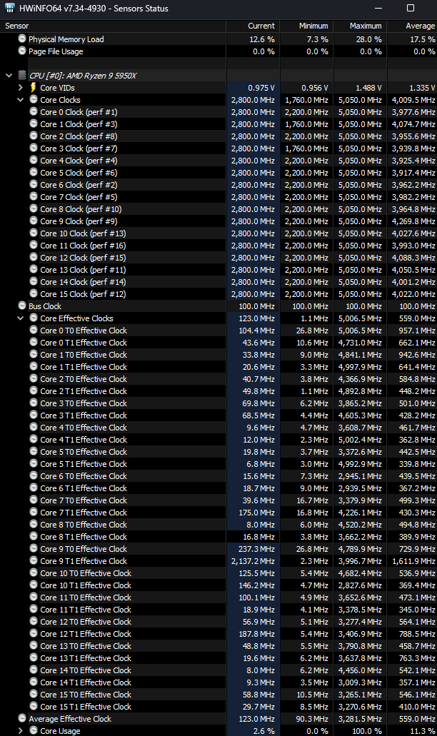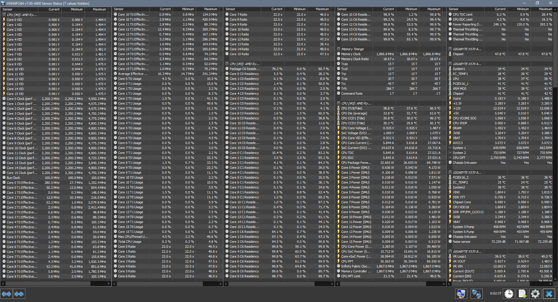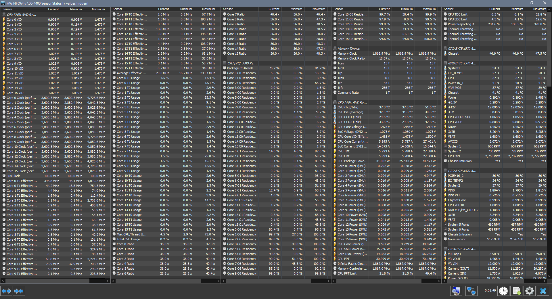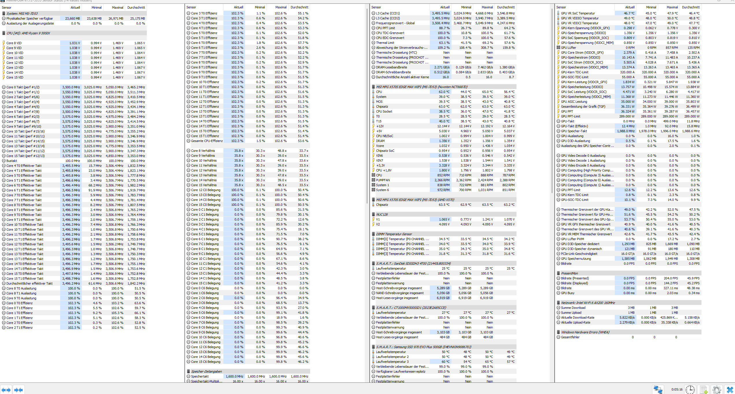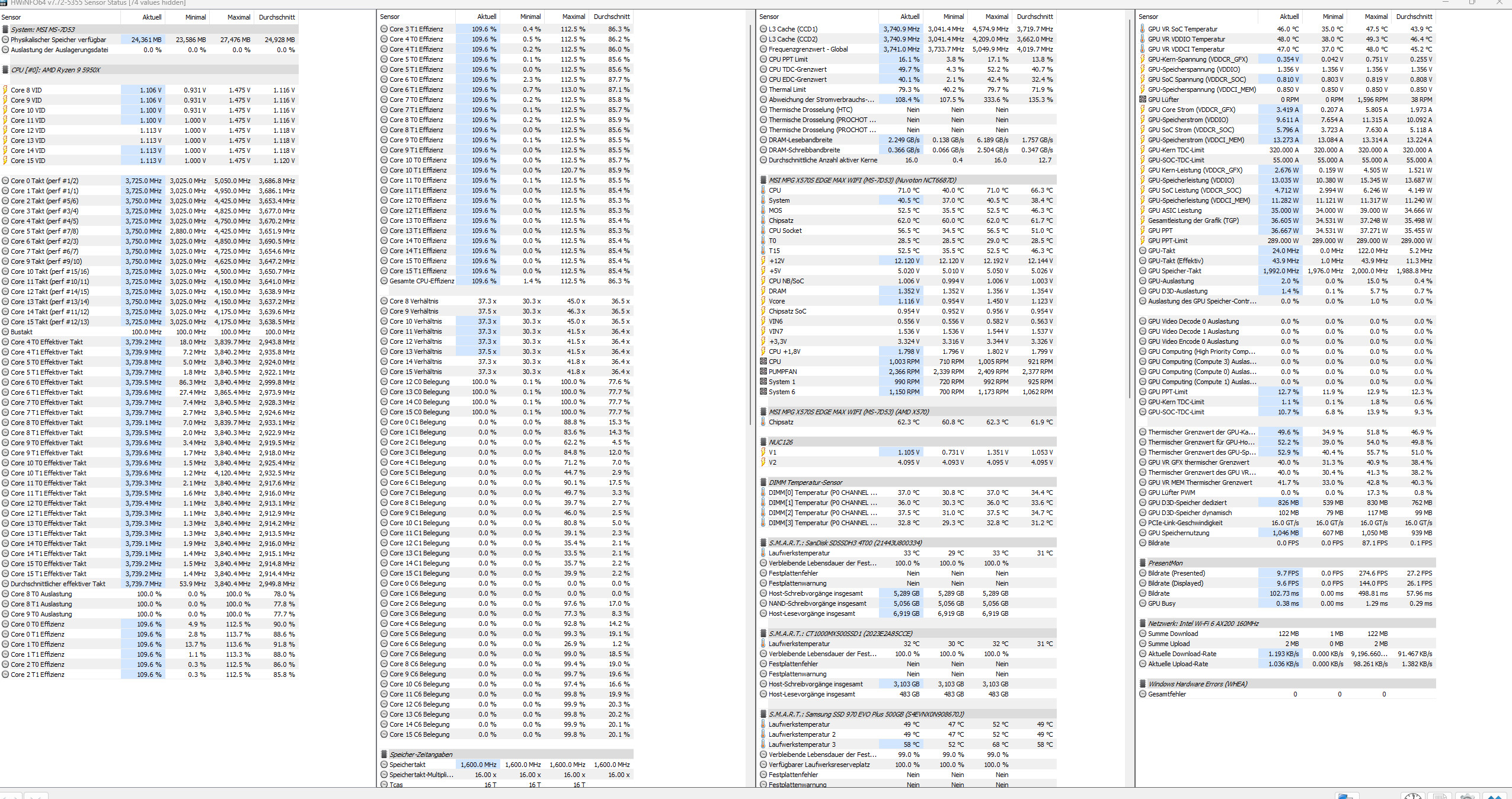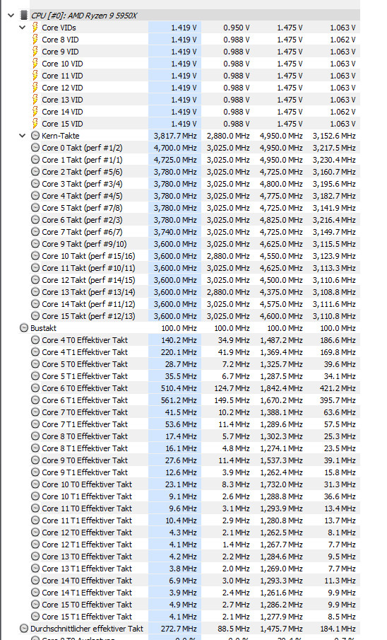 "Interessant" ist, dass die Leistungsanzeige von AMD deutlich geringere Werte ab 1GHz anzeigt, aber eine Taktrate "gegen" Null findet sich nicht, anders als ich es vom 5800X gewohnt war.