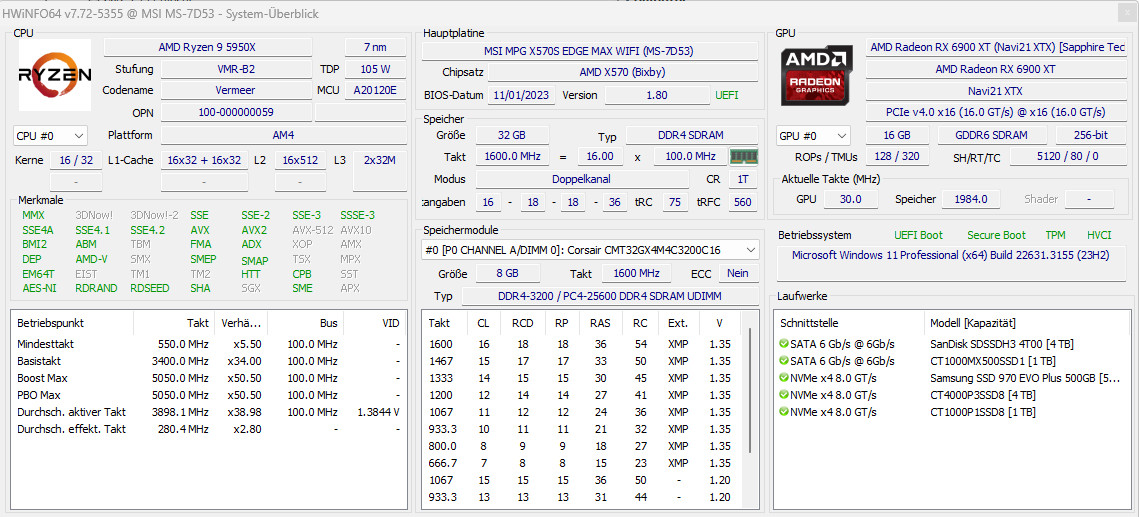 Die Software ist Win11 23H2, ich habe das OS nicht neu aufgesetzt, da ich es (eigentlich) benötige und eine Neuinstallation scheue. Ich persönlich vermute irgendeine Bios-Einstellung hinter dem Problem...
