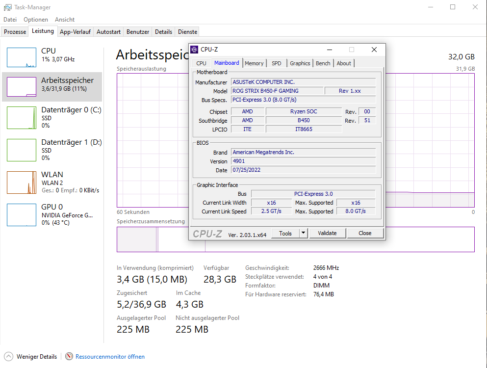 Und zwar stehe ich vor dem Problem, dass ich nicht verstehe wieso laut CPU-Z und dem Taskmanager mein Arbeitsspeicher auf 1067mhz laufen (x2 also wie im Bios 2133mhz), obwohl es 3200er sind? Laut AMD lese ich, wird eine Geschwindigkeit von BIS ZU 2933mhz unterstützt, aber unter welchen Voraussetzungen? Ich habe mir ein paar Video angeschaut, in dem im Bios ein Profil freigeschaltet wird und man dort dann die mhz auswählen konnte. Habe mich von 3200 auf 2800 heruntergearbeitet, aber sobald ich den PC neu startete, ging er erst aus und dann wieder an. Daraufhin habe ich im Bios, weil mir das doch auf die Nerven ging, alles auf "Load default settings" gestartet (hoffe das ist immer ein sicherer Rückzug?). Jetzt habe ich noch aus den 3 Profilen (hatte das Gefühl wie bei einem Auto) ECO,Normal und Performance dann das Performance-Profil ausgewählt. Anscheinend läuft der Prozessor jetzt auf 3,4ghz anstatt auf 3,2.
