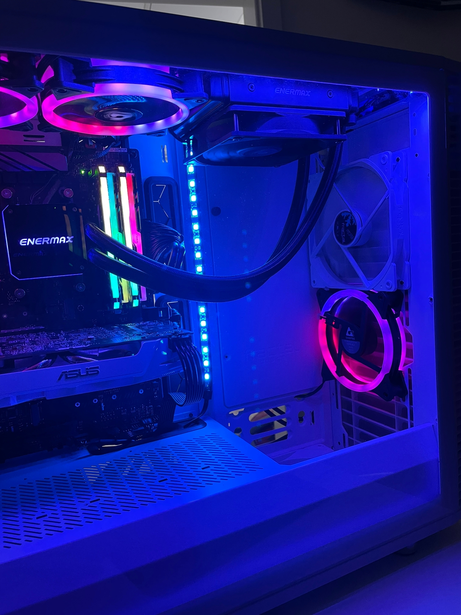 Okay neues Update: Habe alles ein wenig umgebaut, sprich die Wand jetzt nach hinten versetzt, sodass man den ganzen PC einsieht. Kompakt Wasserkühlung nach oben versetzt und den vorher oben liegenden RGB Lüfter dafür nach vorne als Zufuhr für das Gehäuse. Unten auf dem Boden befindet sich der selbe weiße Lüfter als Zufuhr.