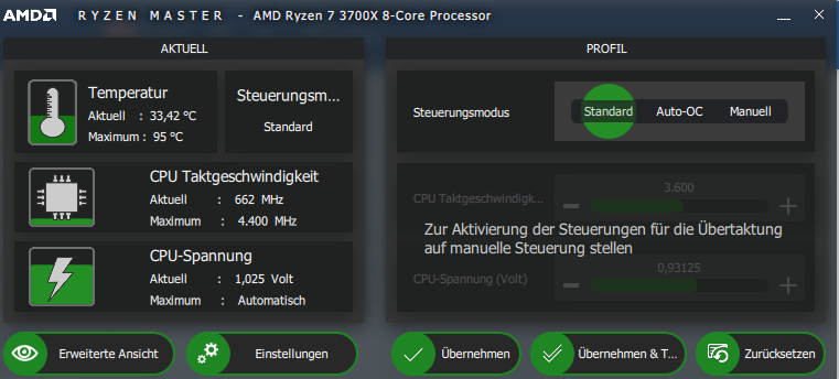 Habe den Chipsatz Treiber installiert evtl. habe ich den vergessen xd. Habe jetzt AMD Ryzen Balanced drin. Der takt geht jetzt von 500Mhz auf 3,3Ghz und dann auf 3,6Ghz und dann wieder runter. Bei 3600Mhz hat er so um die 50° was mich irgendwie wundert. (Nicht wundern, habe den PC aktuell bei meinem Vater im Zimmer stehen, da meins renoviert wird.)