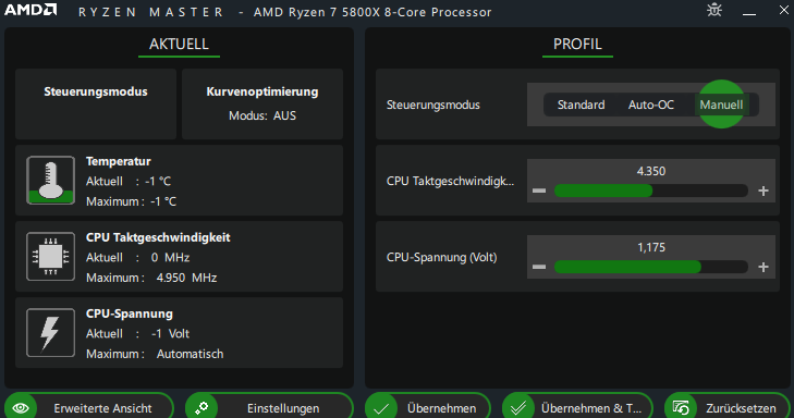 Ich habe über Ryzenmaster die Geschwindigkeit schon so angepasst das er UnderVOlt läuft sprich auf einer Taktgeschwindigkeit von 4,350 und CPU Spannung auf 1,175 Volt. Als ich Cinebench laufen lassen habe ist die Temp max nie über 70Grad gegangen womit ich fine wäre. Pinne nochmal ein Bild an von ryzen Master sowie vom Taskmanager.