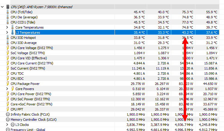 Mal eben nachgeschaut: thermisch ist der L3 kein Problem (siehe Anhang)incurable schrieb:Ja, da sitzt ein zusätzliches Cache-die auf dem CPU-chiplet welches nicht nur den Wärmedurchgang behindert sondern auch noch selbst heizt.
