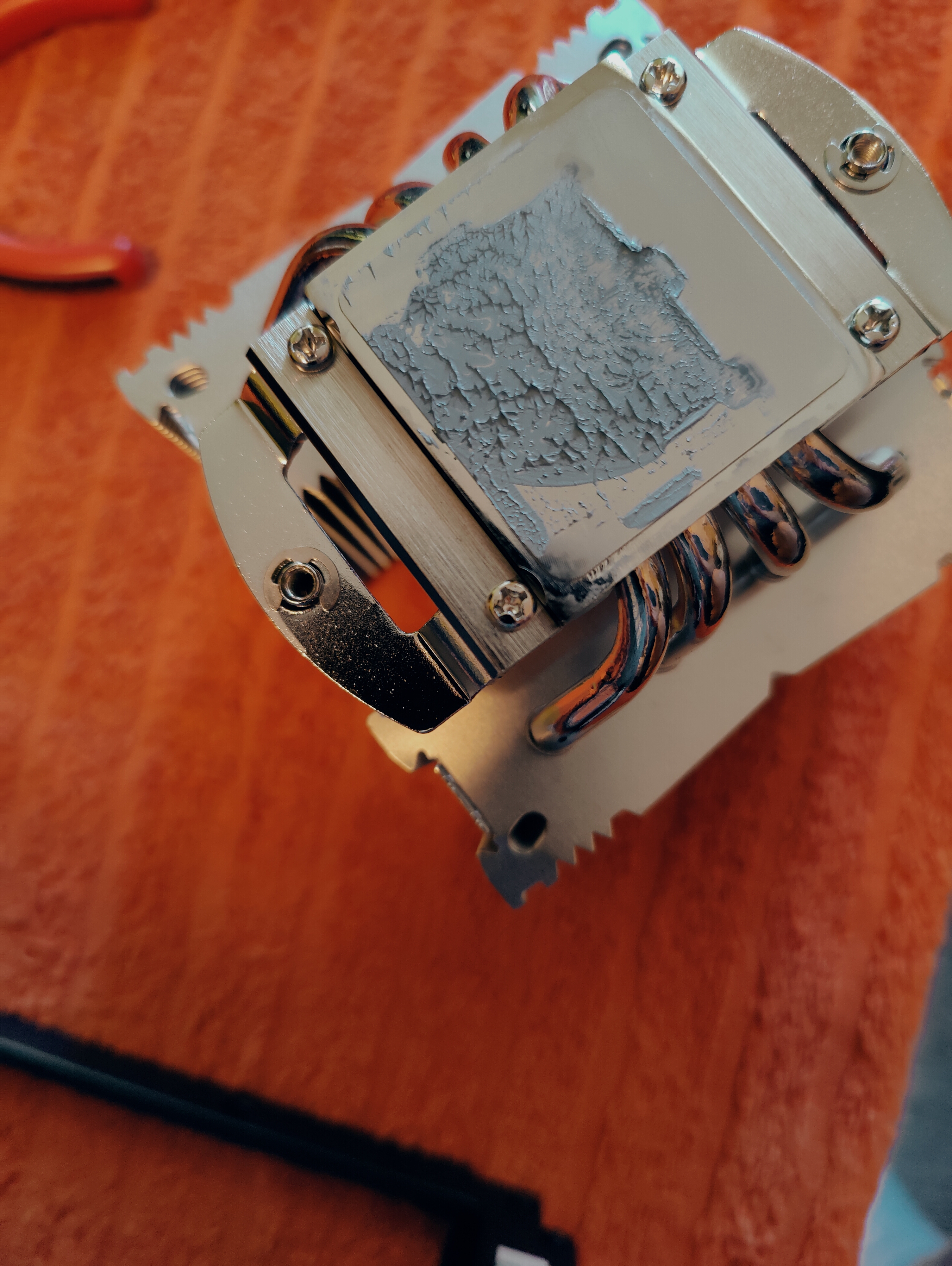 Also Operation geglückt, auch wenn das Abdruckbild vom Kühler eigentlich gut ausgesehen hatte. Hier ein Bild nach dem Abbau, die Paste war mir doch etwas zu weit am Rand, daher wieder der Standard-Mout ohne Offset.
