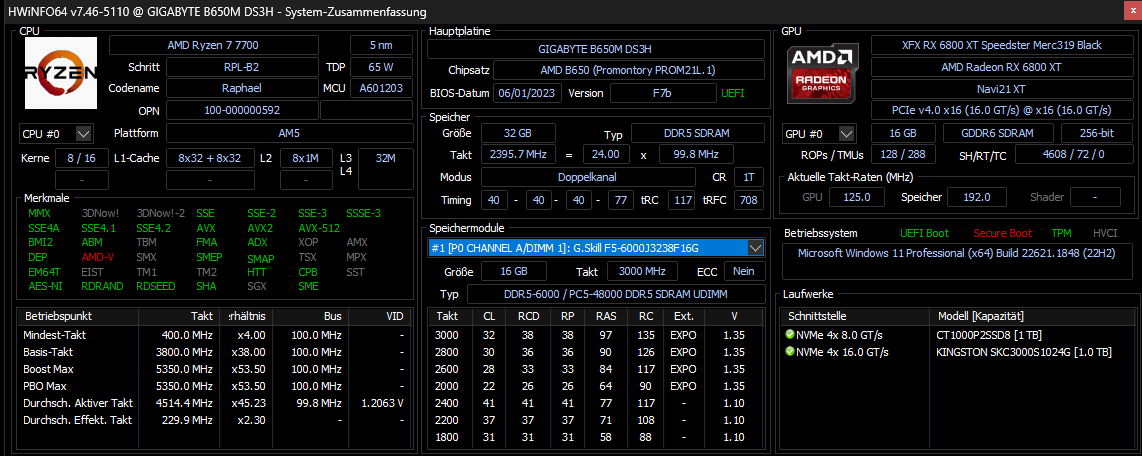 - Arbeitsspeicher (RAM): G.Skill Flare X5 DIMM Kit 32GB, DDR5-6000