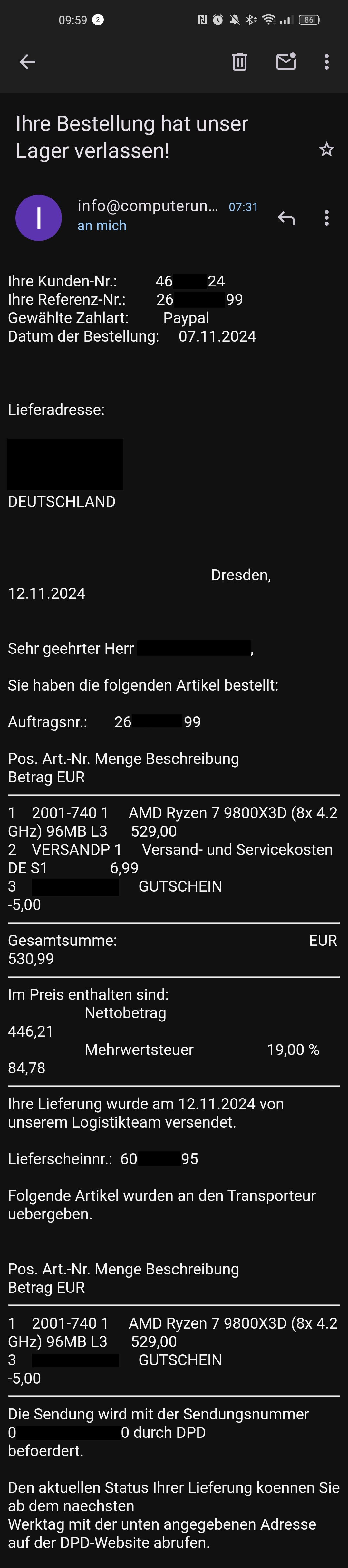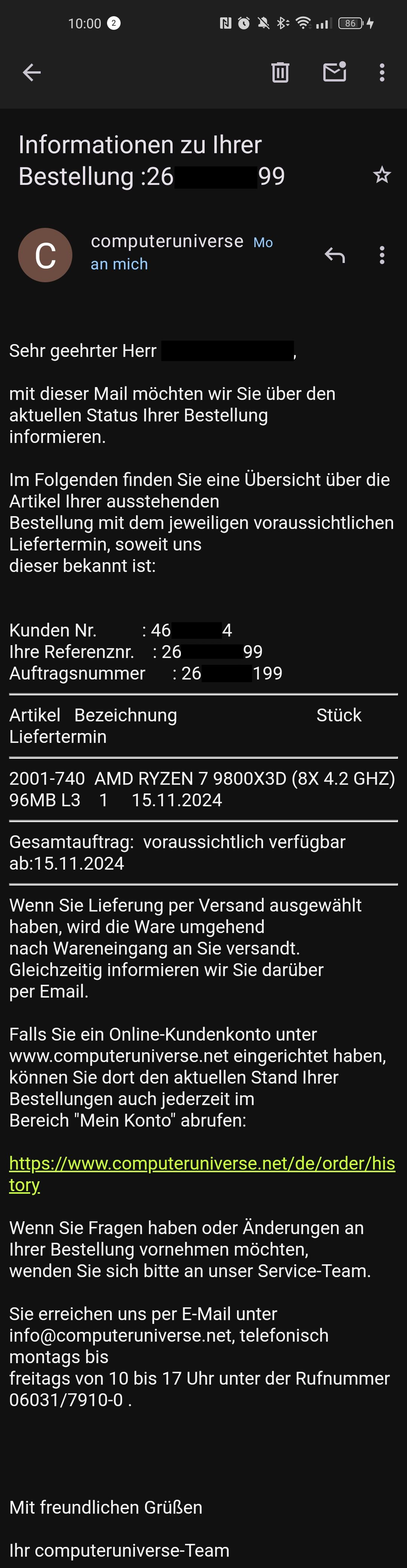 SKu schrieb:Ich finde Mindfactory zu geil. Ich habe am 07.11 bestellt als noch lagernd stand und habe auch eine Bestellbestätigung bekommen. Wann die CPU geliefert werden soll, weiß ich nicht. Nicht einmal eine eMail mit einer Entschuldigung kam bislang an. Ich werde mir wohl stark überlegen, ob ich in Zukunft auch noch bei Mindfactory etwas kaufe. Dezember bzw. Januar 2025 wäre ein Brett. Da erwarte ich als Kunde zumindest eine Information seitens des Händlers.