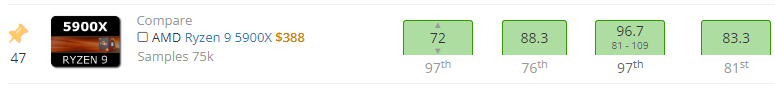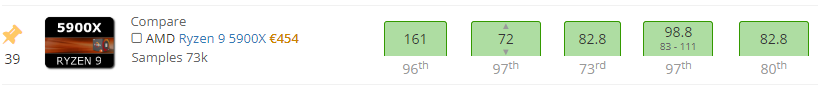 Ganz allgemein lande ich mit meinen AMD-Builds kurioserweise immer in den obersten Perzentilen. So erreicht mein R9 5900X mit einer Wertung von 111% das 94th Perzentil. Das ist eine Maschine unter Luftkühlung maximal konservativ auf Default-Werten mit DDR4-3200er ECC-RAM(!) auf einem ASUS Workstation-Board(!). Trotzdem erzielt mein Build eine höhere CPU-Wertung als 94% der R9 5900X da draußen, nicht?