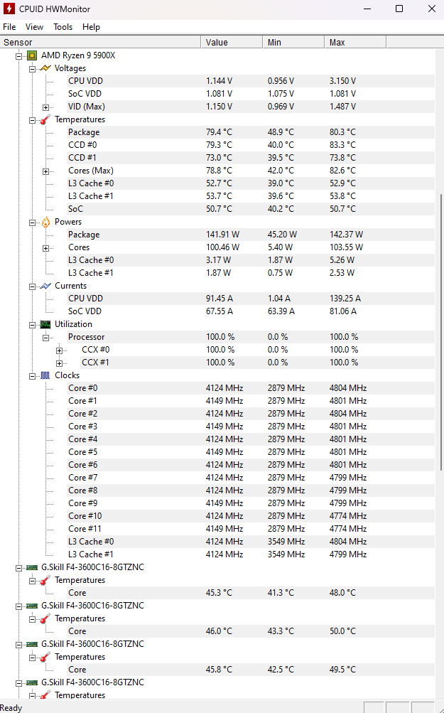 Die CPU erreicht in Benchmarks wie z.B Cinebench die 100% Auslastung, Lüfter sind ebenfalls auf 100% Auslastung, die Temperatur bleibt hier aber zwischen 79 Grad zum Ende hin 87 Grad.