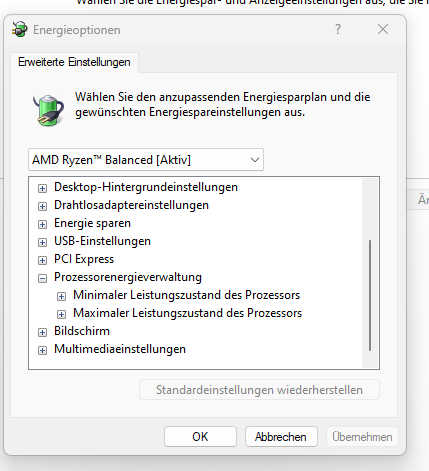 Alle Treiber / Firmware / Bios sind aktuell. Ich habe zudem die Energiesparoptionen in Windows 11 auf "ausbalanciert" gesetzt.