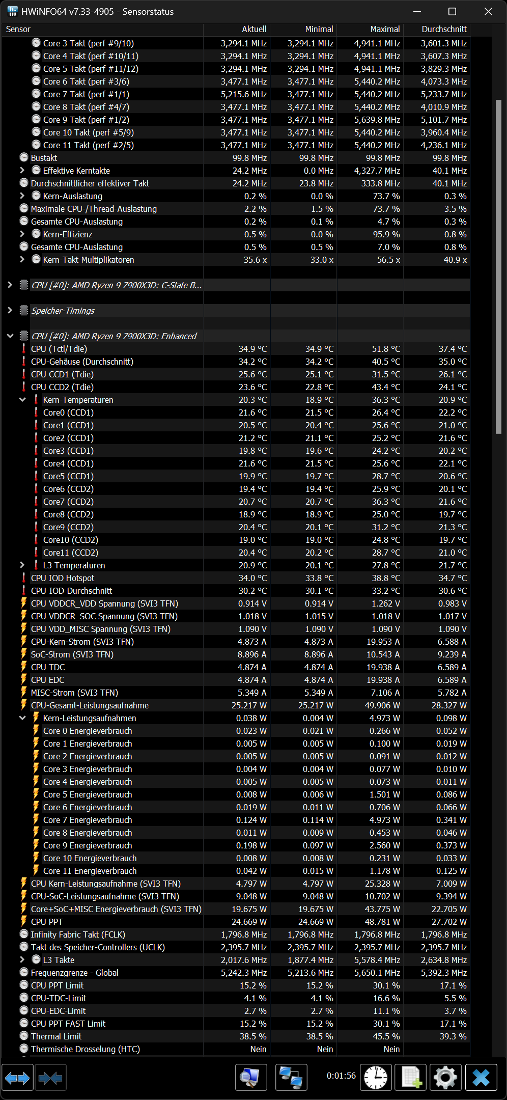 Ich bin gerade absolut überrascht was hier beim 7900X3D los ist. Statt der 36W out of the box, genügt dieser sich mit nur 25W out of the box. Das ist ein riesiger Unterschied. Ich habe keine Ahnung woher das kommt, aber das ist schon irre.