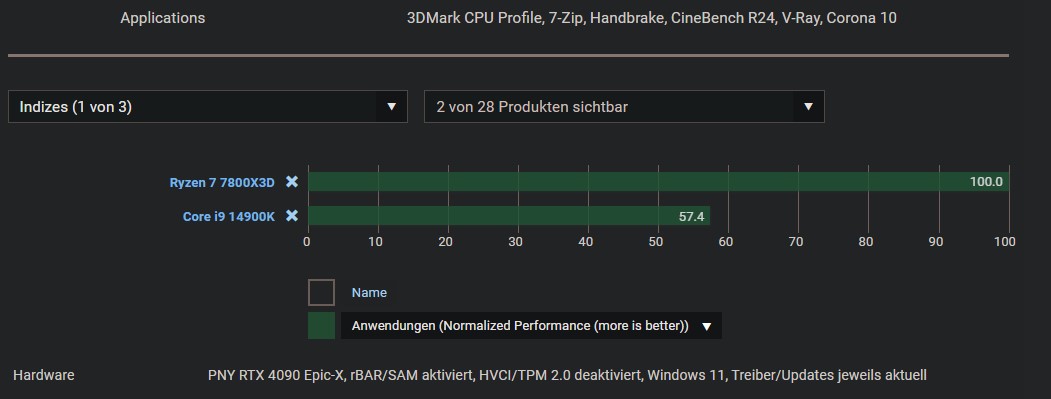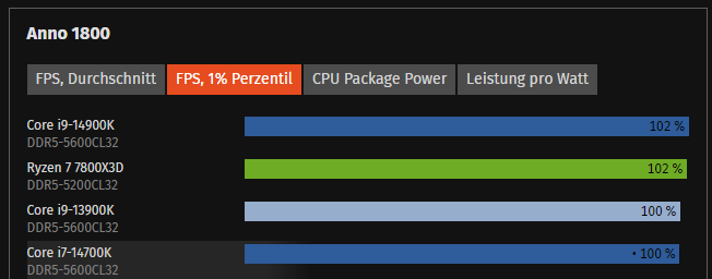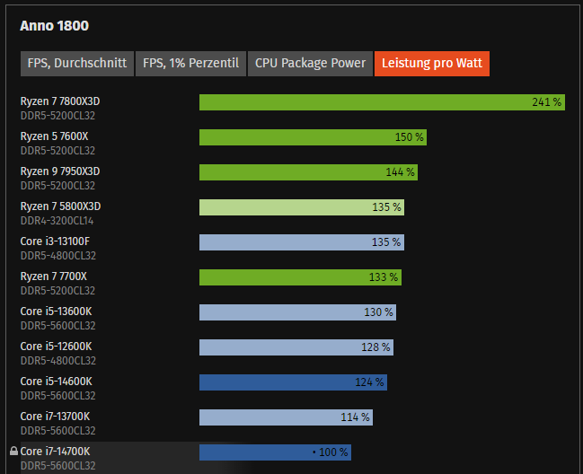 340€ zu 380€ monolitisch beim 14700K ist jetzt nicht so ein Riesenvorteil beim Preis für AMD. Absolute Mehrleistung ist auch kaum vorhanden, seit Intel den Cache auch vergrößert hat (ich habe hier mal exemplarisch Anno als CPU lastiges Beispiel genommen). Hier bleibt eigentlich "nur" noch die Energieaufnahme in dem Szenario für AMD stehen, wobei man auch hier unterscheiden muß, dass eigentlich "nur" der 7800X3D wirklich der Leistung/Watt Killer ist und die anderen AMD CPUs, vor allem die ohne 3D Cache sich gar nicht so krass absetzen, wie das hier auch gerne in den Raum geworfen wird.