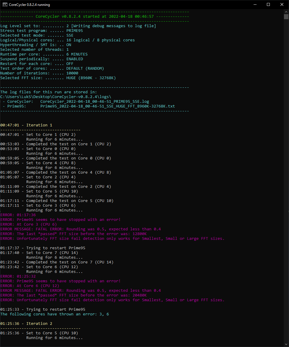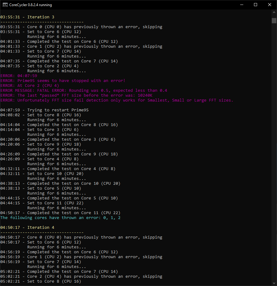 CoreCycler hat aber schon bei der ersten Iteration Fehler auf zwei Kernen ausgespuckt.