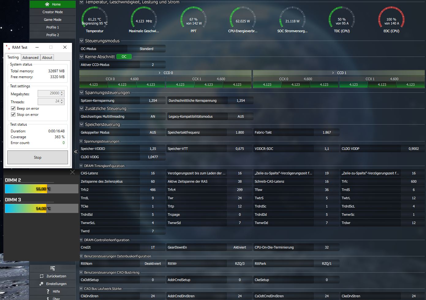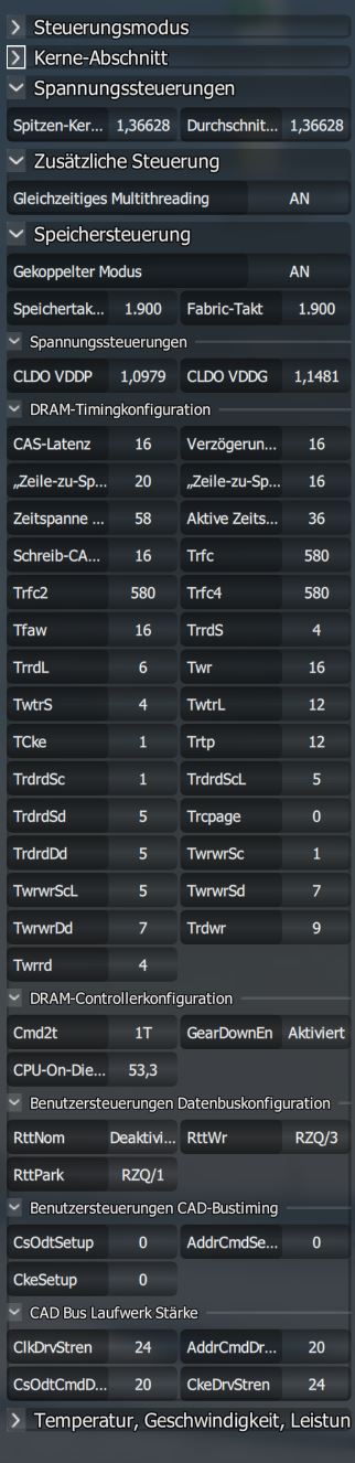 Bei mir steht jetzt noch Subtimes schärfen an. ^^ Haupttimings sind 3466MHz bei 16-16-18-19-36.