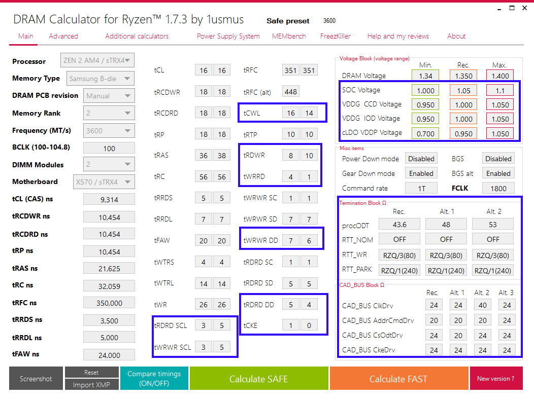 das ist was mit der dram calculator vorschlägt - die blau umrahmten werte habe ich auf vorerst auf "Auto" belassen. entweder weil sie schon von sich aus niedriger ausgefallen sind als das was der calculator vorschlängt, oder weil es probleme gab.