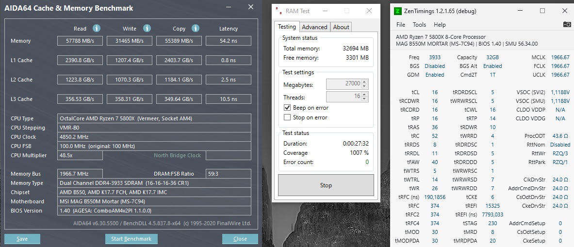 Hallo an alle. Mein 5800X kam heute Nachmittag an und seitdem bastel ich hier rum. Danke für die Hinweise zwecks AGESA und MSI Boards, denn die CPU lässt sich nicht wirklich wie gewünscht übertakten und ich hoffe es liegt einfach nur am Bios (z.B. Vcore Override: CPU bleibt beim Grundtakt stehen). Zum RAM OC: